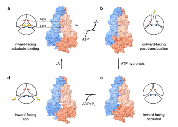该研究通过比较AtABCG16的不同构象发现,AtABCG16在胞质侧具有两个独立的底物入口,分别通往各自的底物结合口袋,并与二聚体组成的跨膜转运通道相连。同时,两个芳香族氨基酸Y494与F608位于底物入口和跨膜转运通道中,分别控制二者的开闭。这一结构特征决定了AtABCG16转运蛋白的跨膜转运机制与已知的ABC转运蛋白不同。基于结构和生化分析,研究提出了AtABCG16介导的茉莉酸跨膜转运的工作模型。