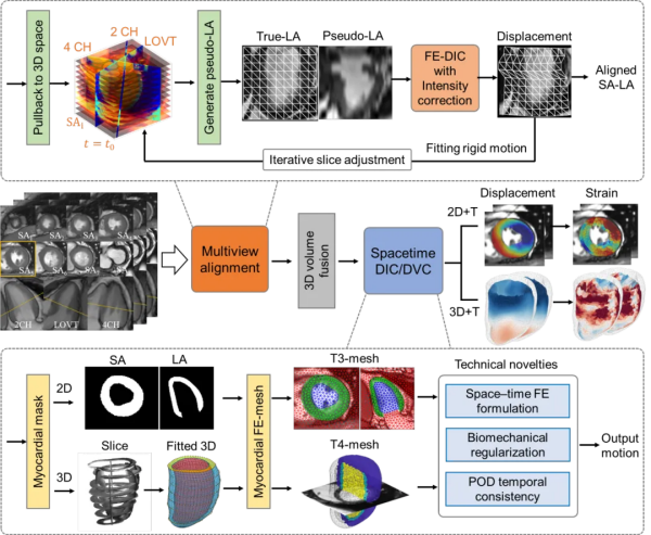 该框架以有限元形函数表征心肌位移场,通过全局相关优化保证空间连续性并引入符合生理特性的力学约束以抑制噪声放大和非物理形变;同时结合基于奇异值分解的数据驱动时空模态分解策略,确保时间连续性,并显著降低计算复杂度,实现了从常规Cine MRI到心肌运动场与应变场的统一求解。