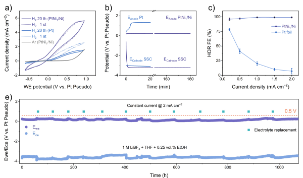 PtNi1催化剂表现出了卓越的性能:在THF电解液中,其HOR法拉第效率接近100%,且稳定性超过1000小时,抗毒化性能远优于商业Pt电极。