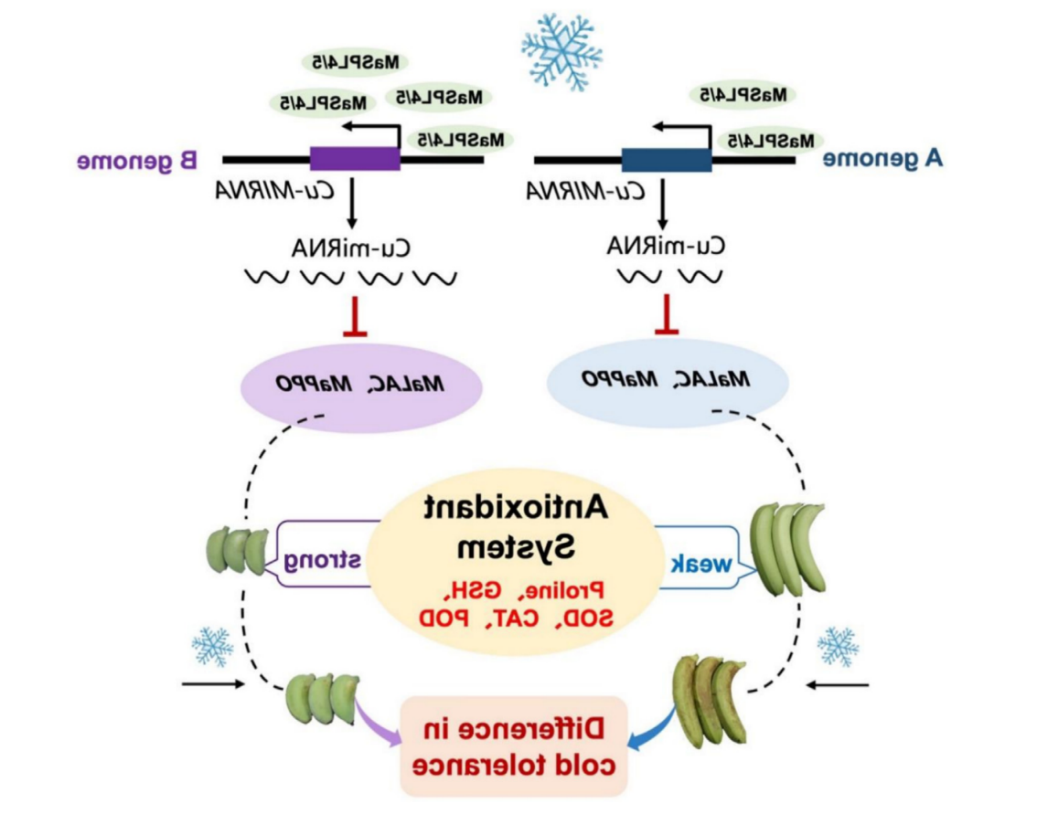 基于以上研究,团队提出了Cu-miRNA介导AAA与ABB品种香蕉果实耐冷性差异的假说机制。在冷胁迫下,相较于AAA型果实,ABB型果实中MaSPLs明显上调表达,且MaSPLs对B基因组上Cu-MIRNA启动子的转录激活作用更强,从而诱导更高丰度的Cu-miRNA积累,相应下调其靶基因表达,参与调控氧化还原稳态,通过提升果实抗氧化能力,最终增强果实耐冷性。