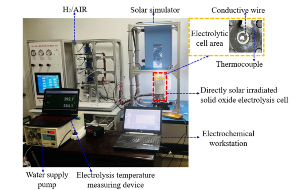 该团队创新性地提出直接耦合式太阳能高温电解的概念和设计方案。通过研究高强度、非均匀入射辐射在多孔电极内部的传输特性和聚光工况下微尺度流动与多孔结构辐射换热的耦合机理,该团队研制出直接耦合式太阳能高温电解原理样机,揭示了聚光太阳能对电解池浓差极化的影响机理。与同规模下电加热固体氧化物电解池相比,该技术使固体氧化物电解池启动速度提高了近12倍,并使电解能耗降低了76%。
