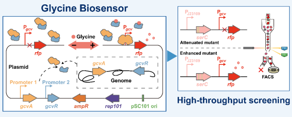 甘氨酸是多种生物中重要的代谢物和细胞信号分子,在细胞代谢和核苷酸合成中扮演关键角色,也是多种高附加值化合物的前体。目前缺乏高效的甘氨酸检测手段且其合成关键酶活性不足,导致甘氨酸细胞工厂的开发进展缓慢。因此,建立一个能够快速、高效且灵敏监测甘氨酸产量的生物传感器对推动甘氨酸的生物制造至关重要。